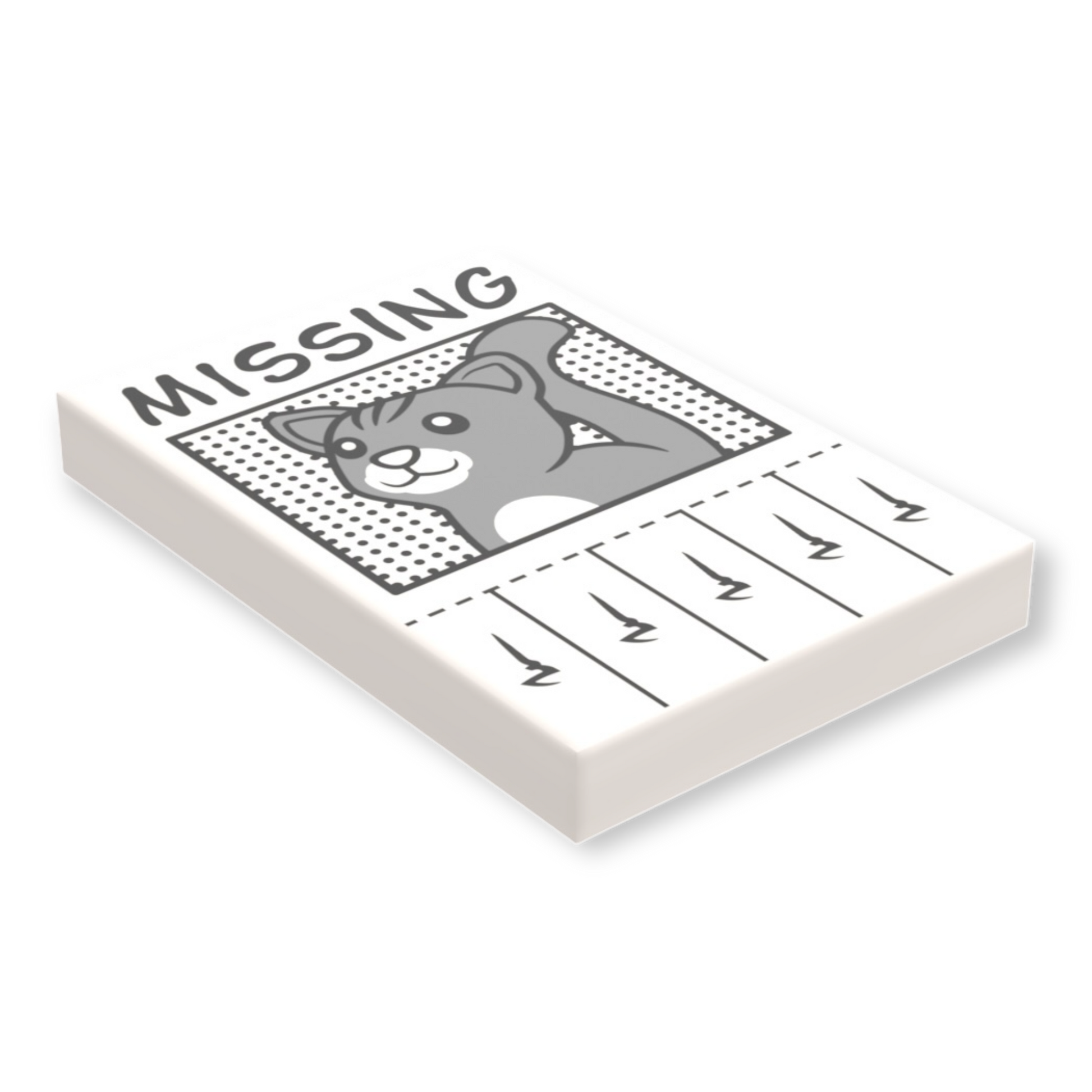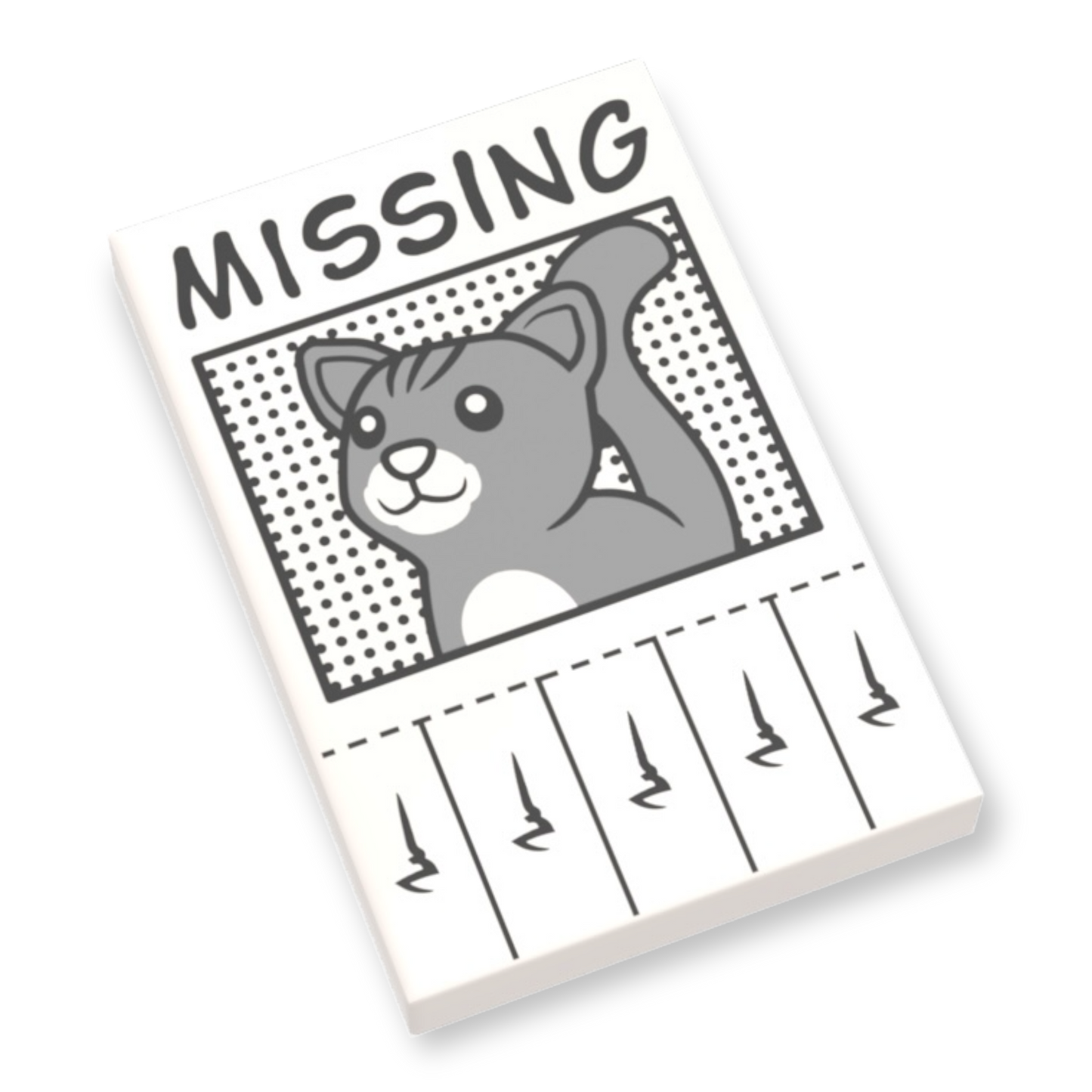 Diese LEGO® Tile 2x3 mit einem Poster, das in schwarzer Schrift “MISSING” und eine dunkelbläulichgraue Katze zeigt, ist ein perfektes Detail für Szenen, die das tägliche Leben oder auch spannende Suchaktionen darstellen.