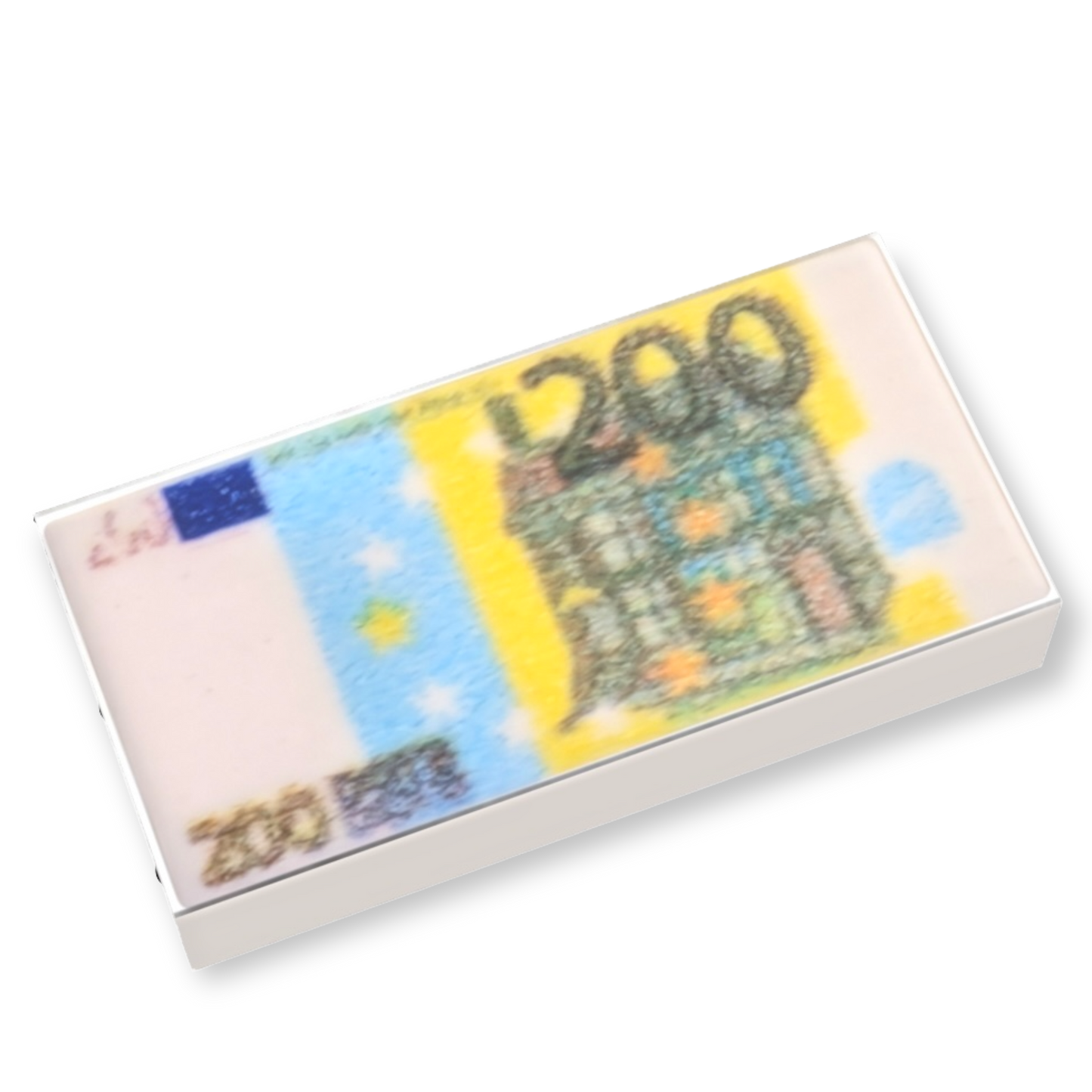 Diese bedruckte 1x2 Fliese zeigt einen gebrauchten Geldschein im Minifiguren-Format mit einem auffälligen „200 Dots“-Design. Ideal, um deinem Klemmbaustein-Szenario oder anderen Bauprojekten eine realistische Note zu verleihen.