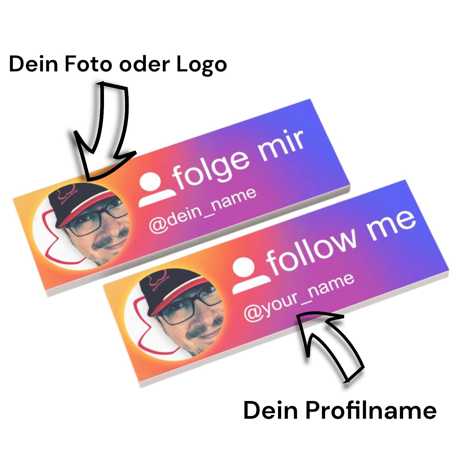 Dieses individuelle LEGO® Schild 2x6 macht deinen Social-Media-Auftritt in der Klemmbaustein-Welt unverwechselbar. Du bekommst ein personalisiertes Profil-Schild im typischen Social-Media-Look mit Farbverlauf, Profilbild, Profilnamen und dem Text wahlweise auf Deutsch ‘folge mir’ oder auf Englisch ‘follow me’. Perfekt für Szenen mit Influencern, Streamern oder Content Creatorn in deiner LEGO® City und als Hingucker auf Fotos, Reels und Stories – so bleiben dein Account und deine Builds garantiert im Gedächtnis und können dir spielerisch neue Follower verschaffen.