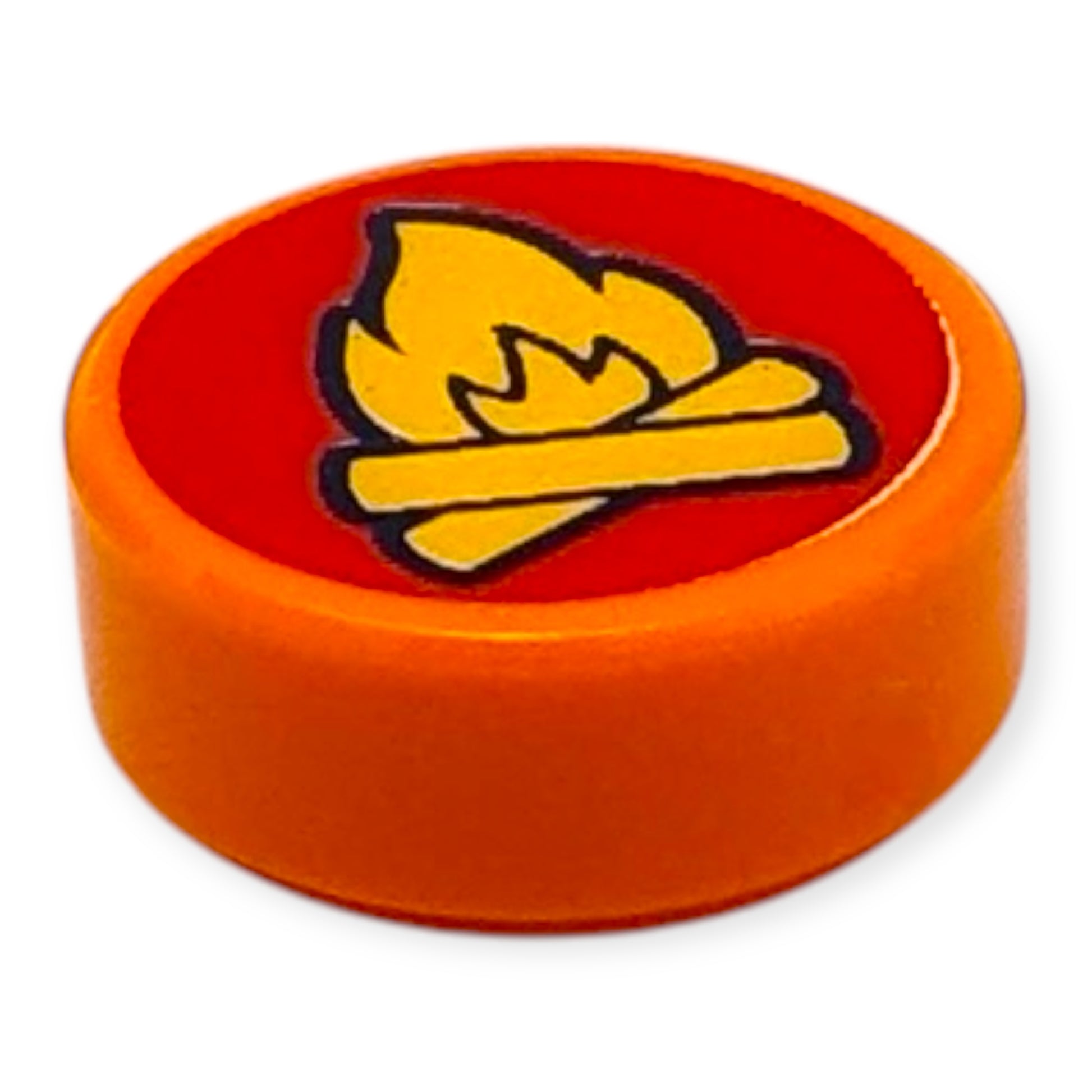 Tuile ronde LEGO® 1 x 1 en orange – avec feu de camp jaune sur fond rouge