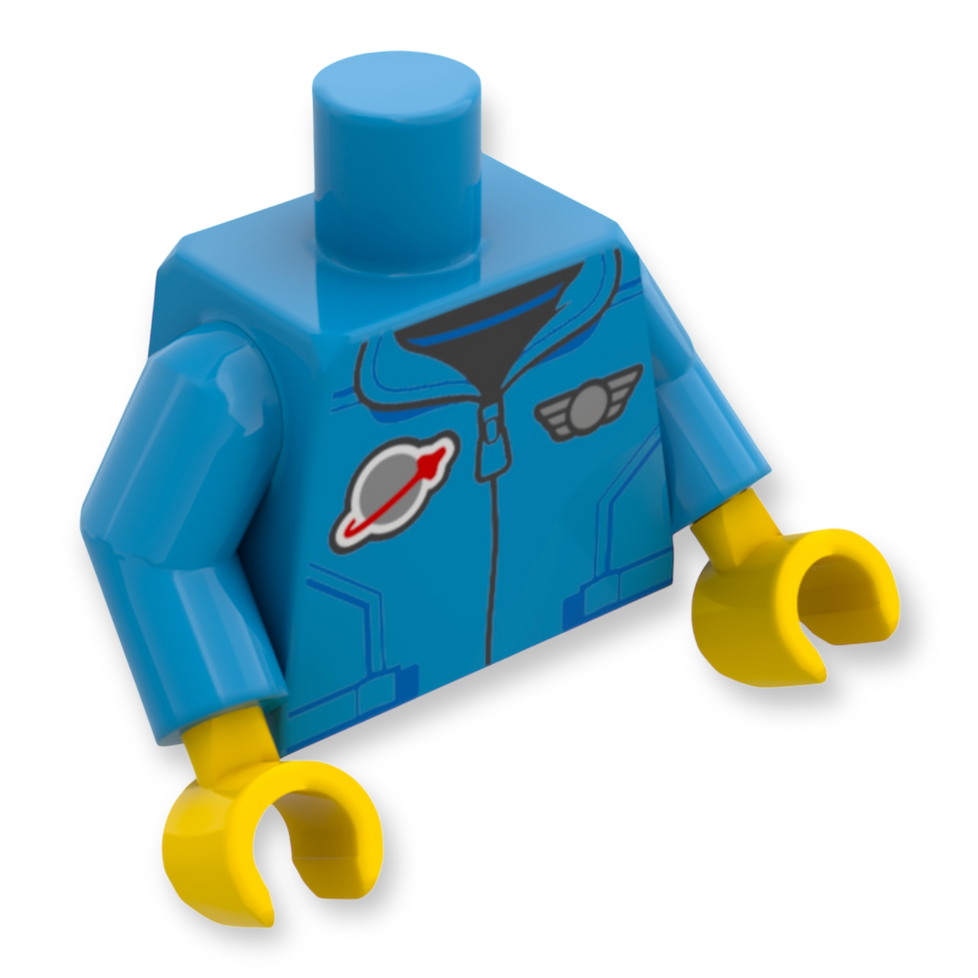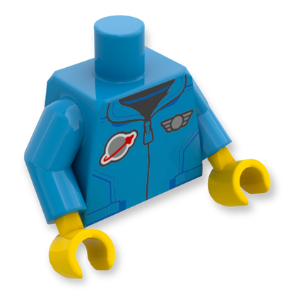Dieser LEGO® Torso zeigt eine moderne Jacke mit Reißverschluss und dem ikonischen klassischen Space-Logo sowie einem silbernen Flügel-Pin. Perfekt für Astronauten oder Weltraumforscher in LEGO® Space-Szenarien, bietet dieser Torso einen futuristischen und professionellen Look.