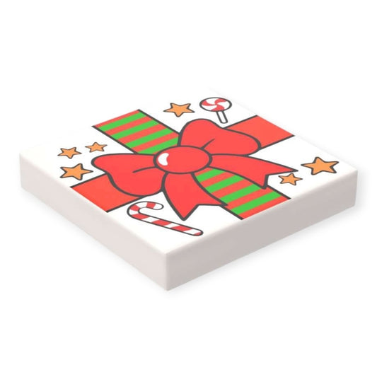 Bedruckte LEGO® Fliese 2x2 Geschenk - Rote Schleife und weihnachtliches Muster