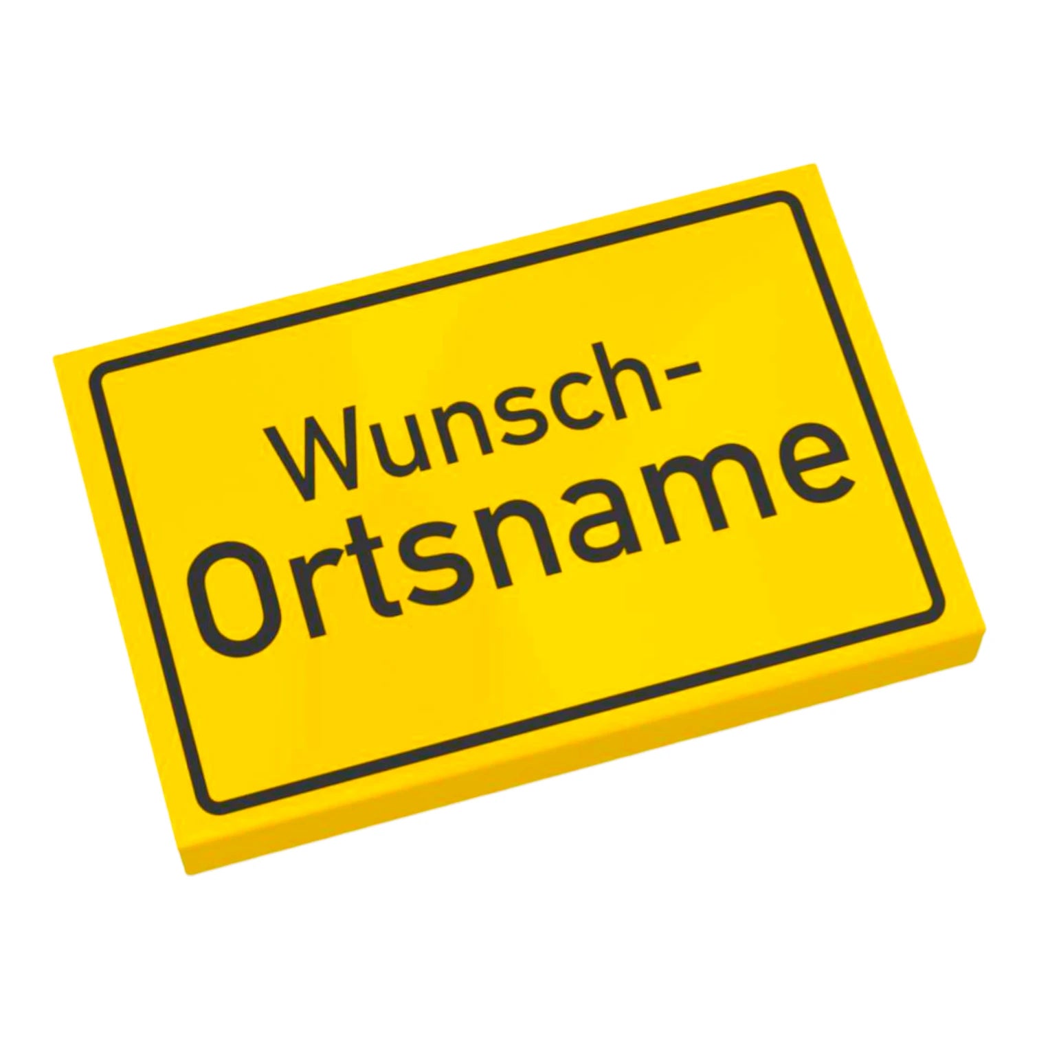 Mit diesem individuellen LEGO® Ortsschild gestaltest du deine eigene Klemmbaustein Stadt ganz persönlich. Auf die gelbe 2x3 LEGO® Fliese passt dein Wunschtext mit bis zu drei Zeilen – zum Beispiel Stadtname, Ortsteil und Zusatz wie Landkreis oder ein witziger Spruch.