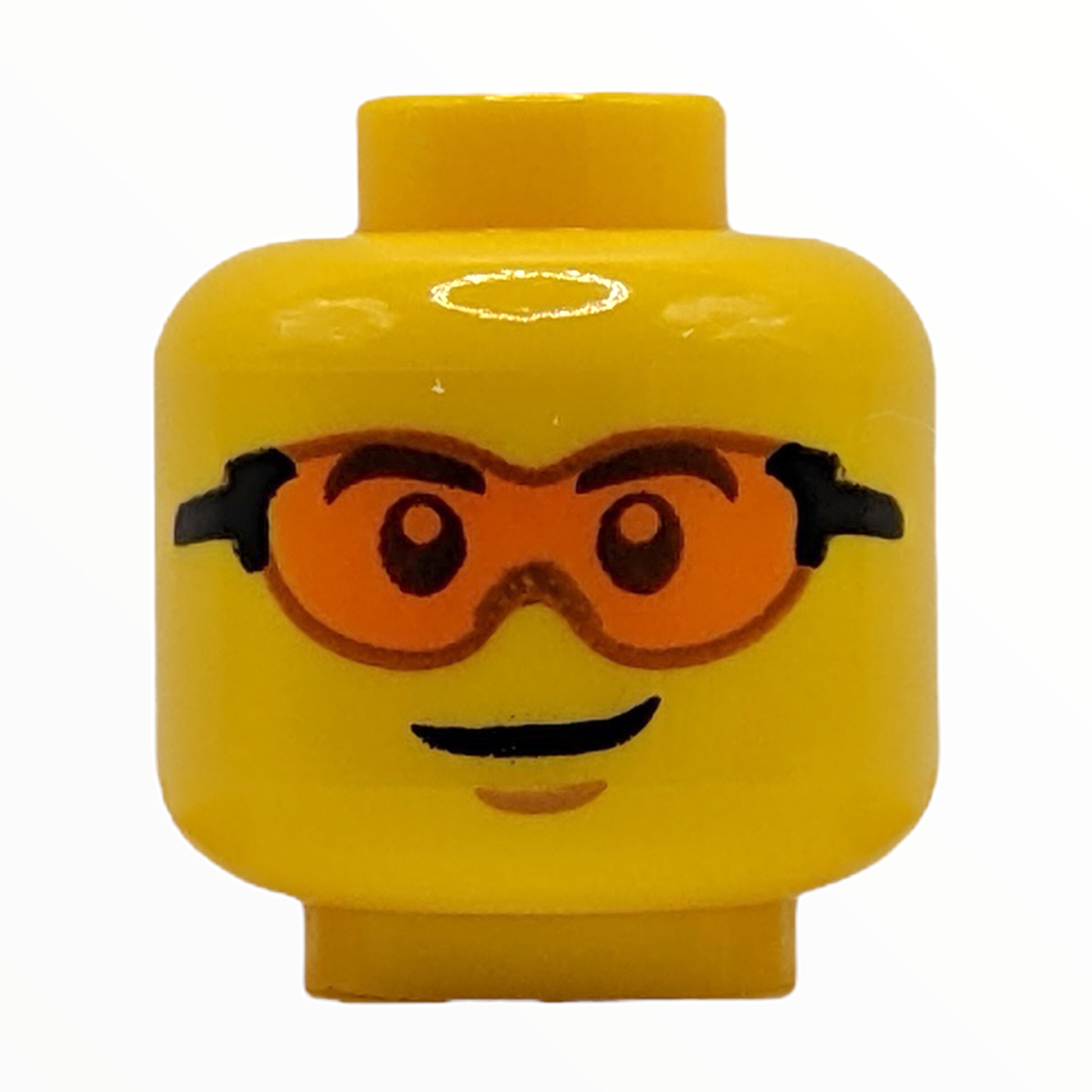 Dieser gelbe LEGO® Minifiguren-Kopf zeigt ein Gesicht mit Schutzbrille mit orangenen Gläsern und schwarzem Rahmen, einem markanten Kinngrübchen und einem schiefen Grinsen. Der Ausdruck verleiht Minifiguren einen selbstbewussten, leicht verschmitzten Look und eignet sich perfekt für Figuren in Arbeitsszenen oder bei spannenden Abenteuern.
