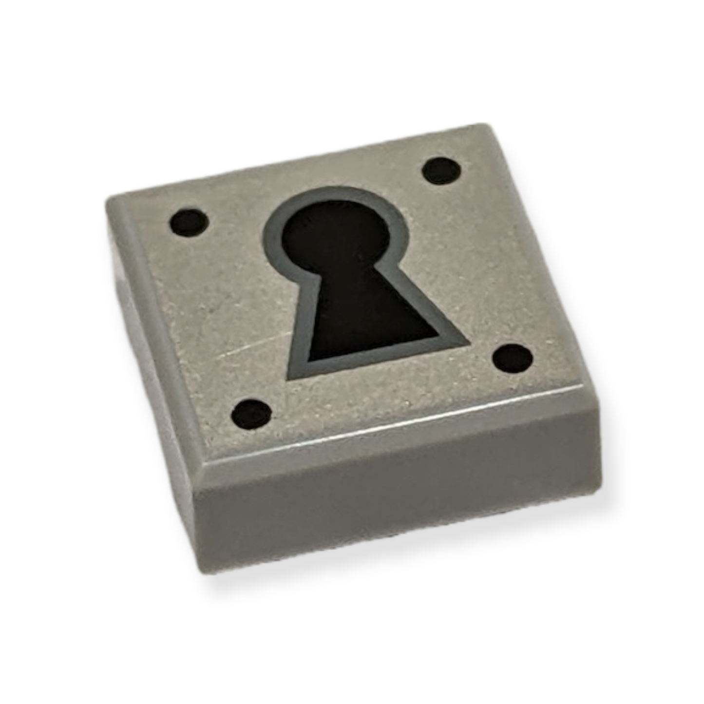 Diese LEGO® Tile 1x1 mit einem schwarzen Schlüsselloch und vier Punkten auf silbernem Hintergrund ist ein kleines, aber wirkungsvolles Detail für Türen, Tresore oder Geheimverstecke in deiner LEGO® City.