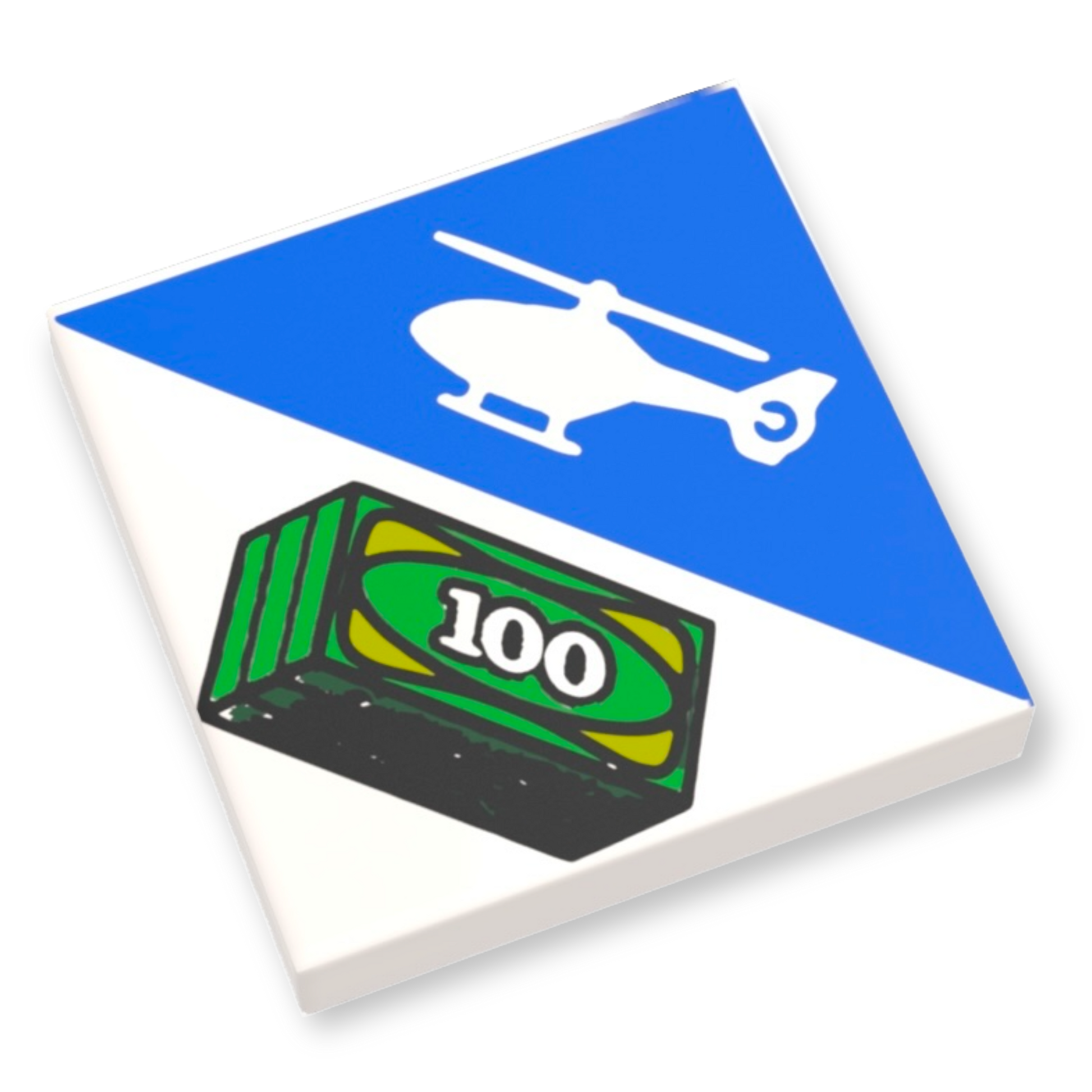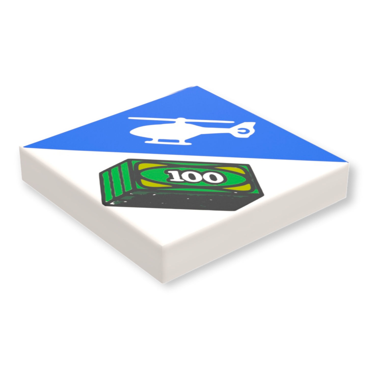LEGO® Fliese 2 x 2 in Weiß mit Aufdruck eines Hubschraubers und eines Stapels 100-Dollar-Scheine – Ein dynamisches Accessoire für Action- und Abenteuerszenen