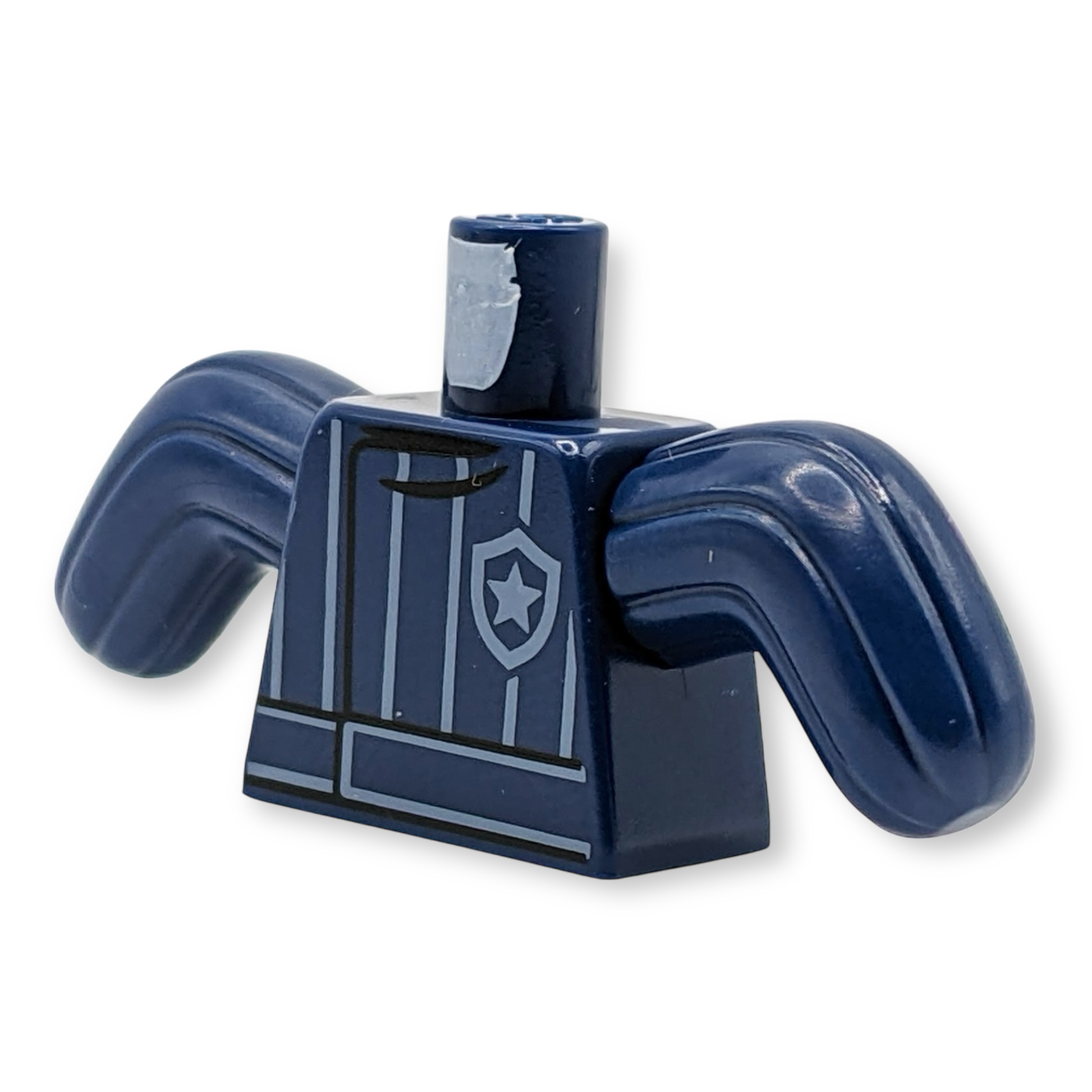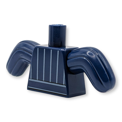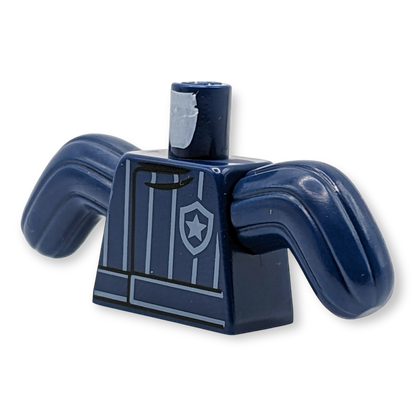 Dieser LEGO® Torso stellt einen speziellen Beißanzug für Hundetrainer dar, komplett mit weißen Nadelstreifen und einem Polizei-Sternabzeichen-Logo. Die dunkelblauen Kaktus-Arme symbolisieren den Schutz, den der Anzug bei Hundetrainingseinheiten bietet, und machen ihn perfekt für Szenarien mit Polizeihunden.